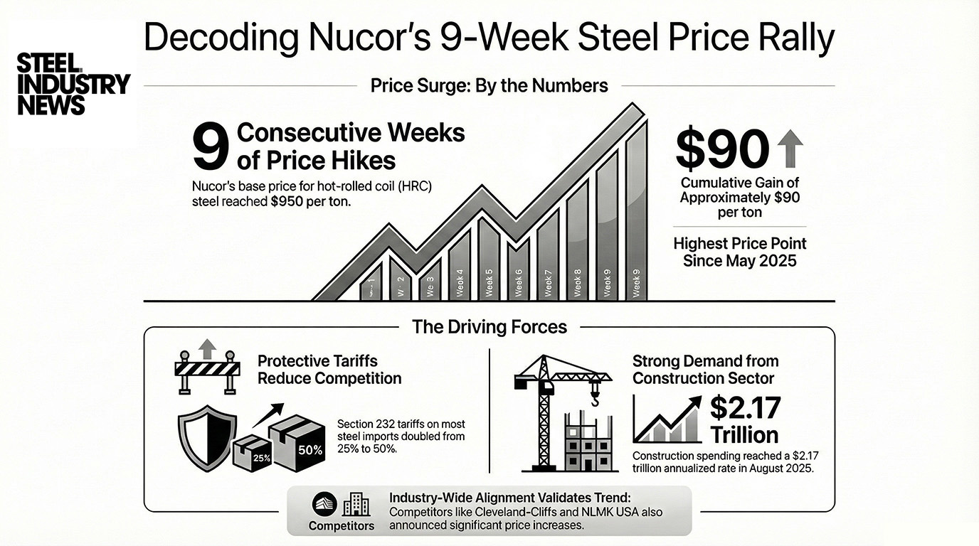 In this episode, we explore Nucor’s remarkable nine-week streak of consistent $10-per-ton price increases for hot-rolled coil, bringing pricing to $950 per short ton in December 2025 - the highest levels since May.